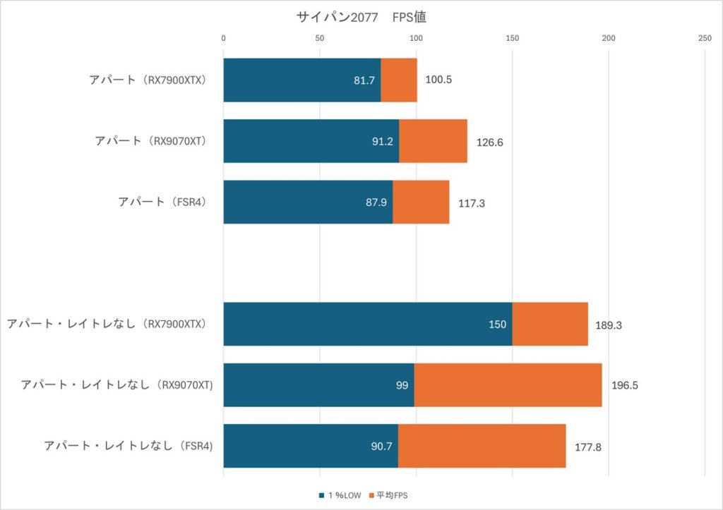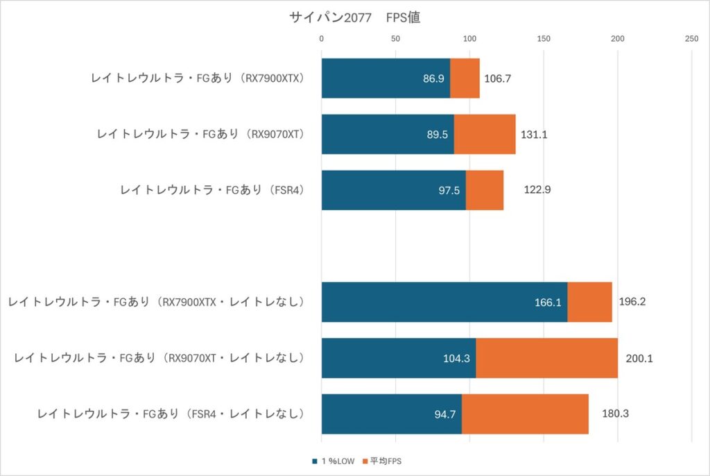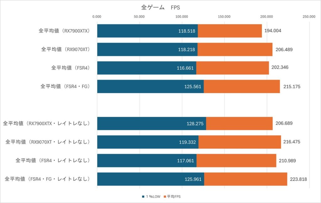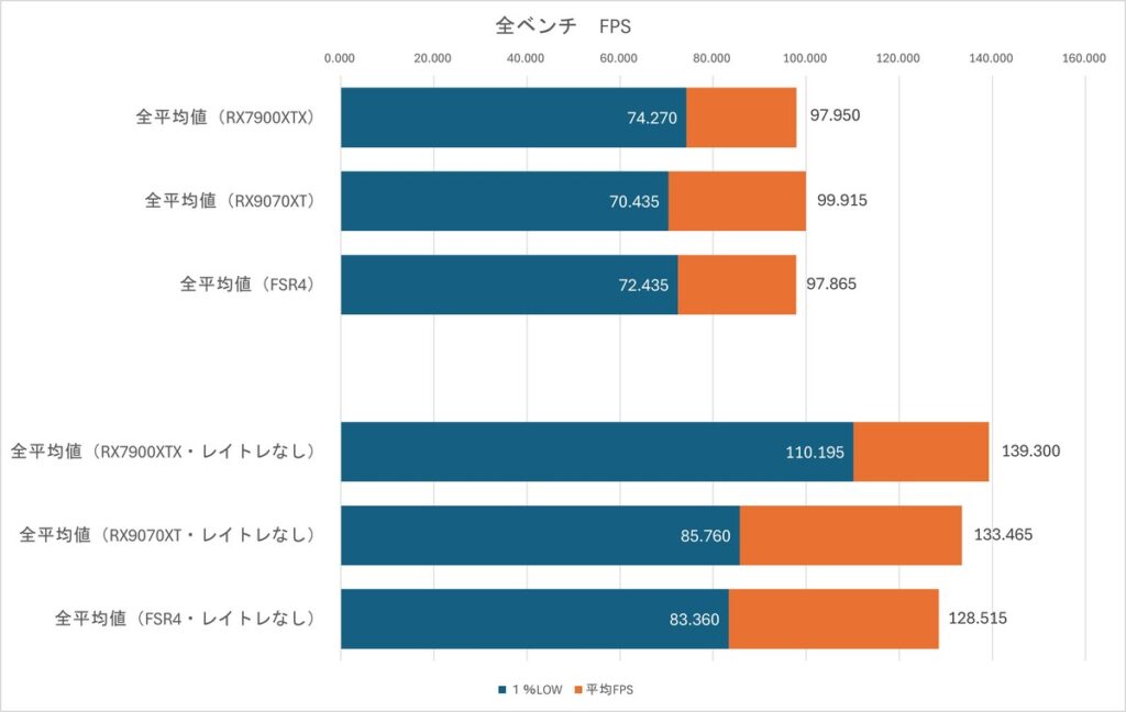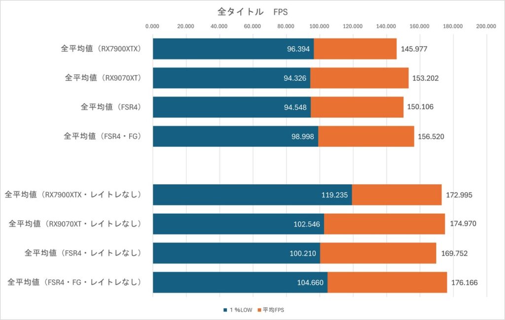 結果レイトレ有無での比率が7900XTXのときには3.8倍以上あったものが、9070XTになると2.5倍まで落ち着く結果となりました。