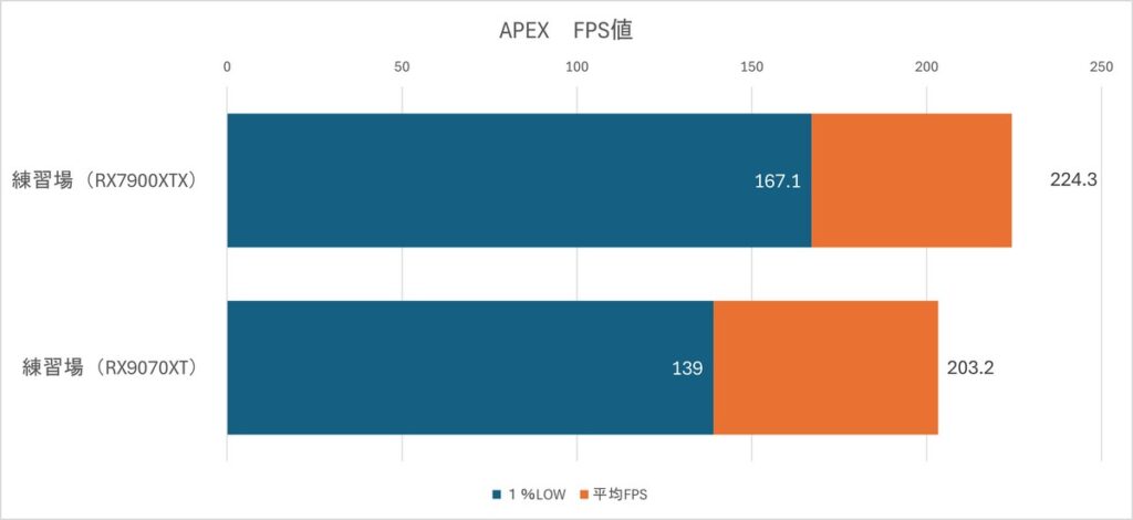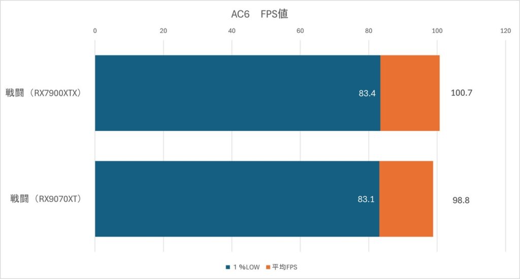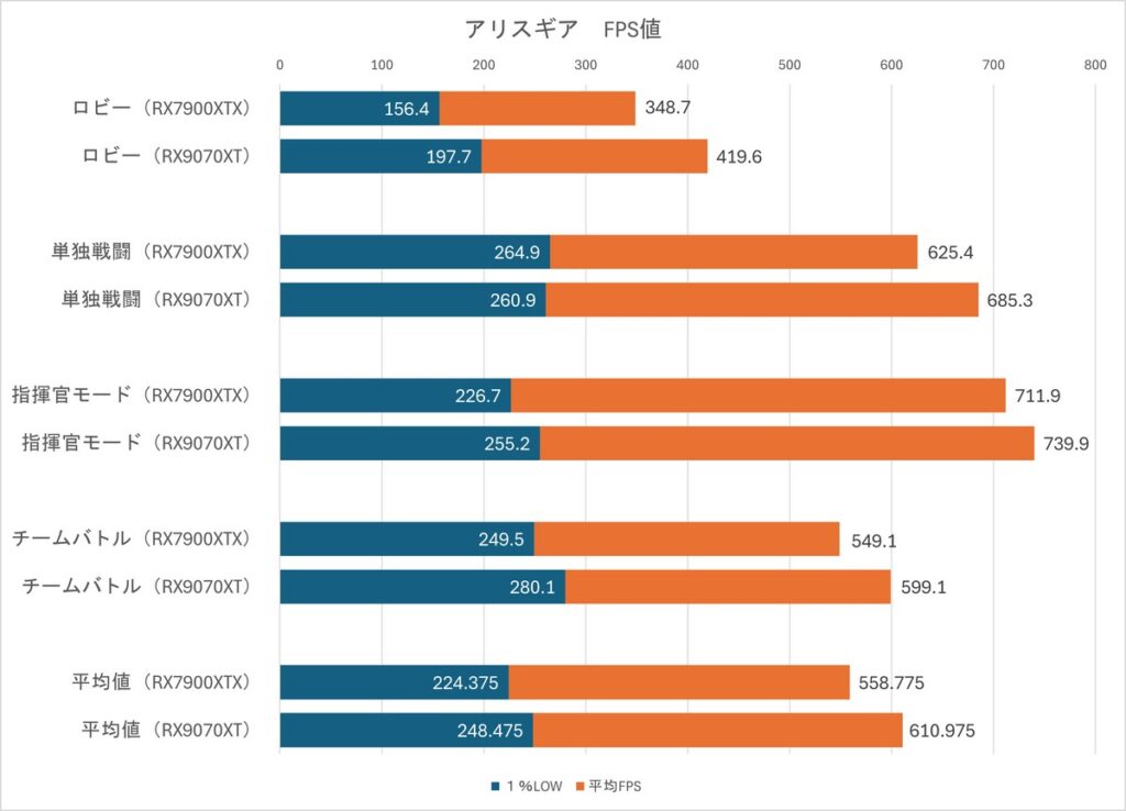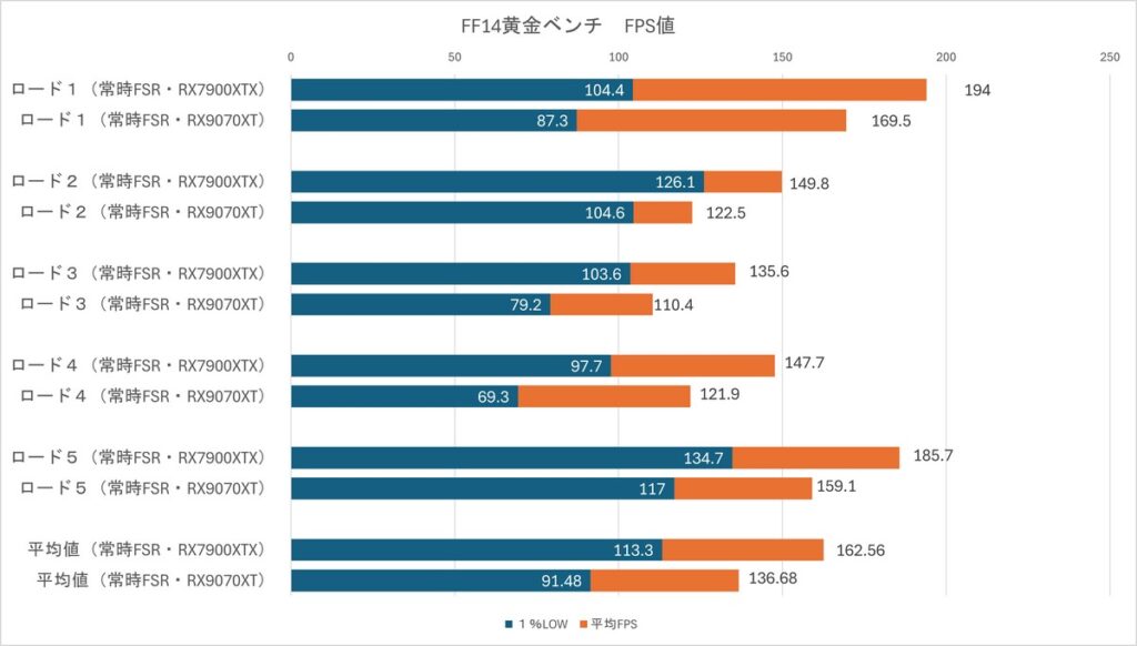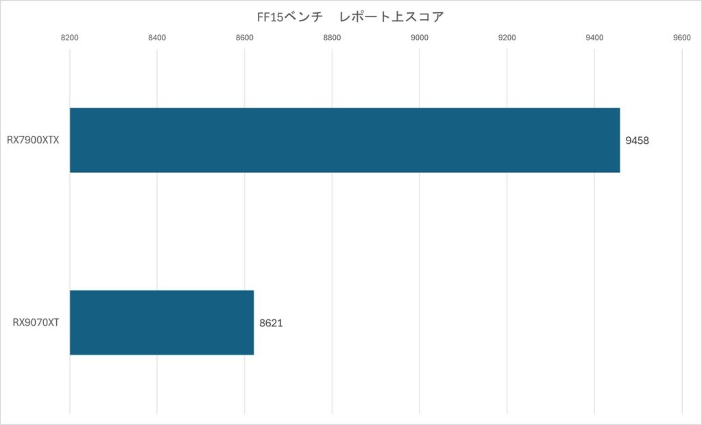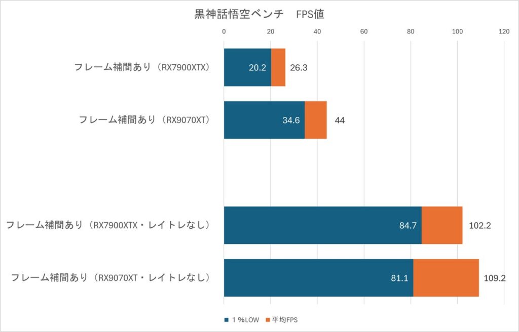 結果レイトレ有無での比率が7900XTXのときには3.8倍以上あったものが、9070XTになると2.5倍まで落ち着く結果となりました。