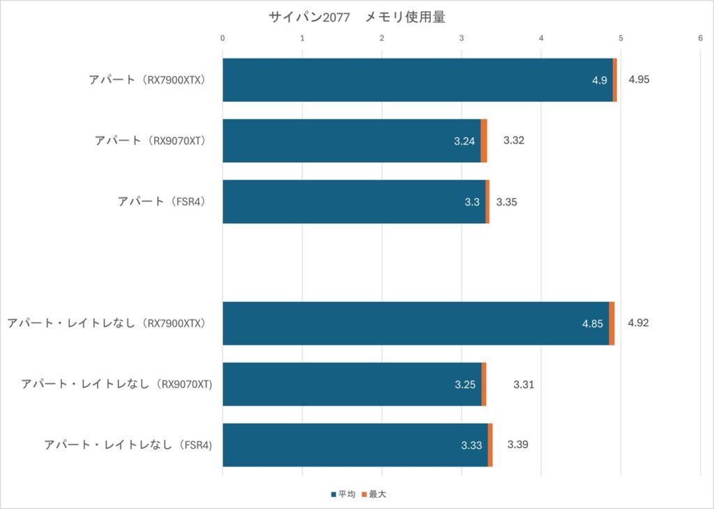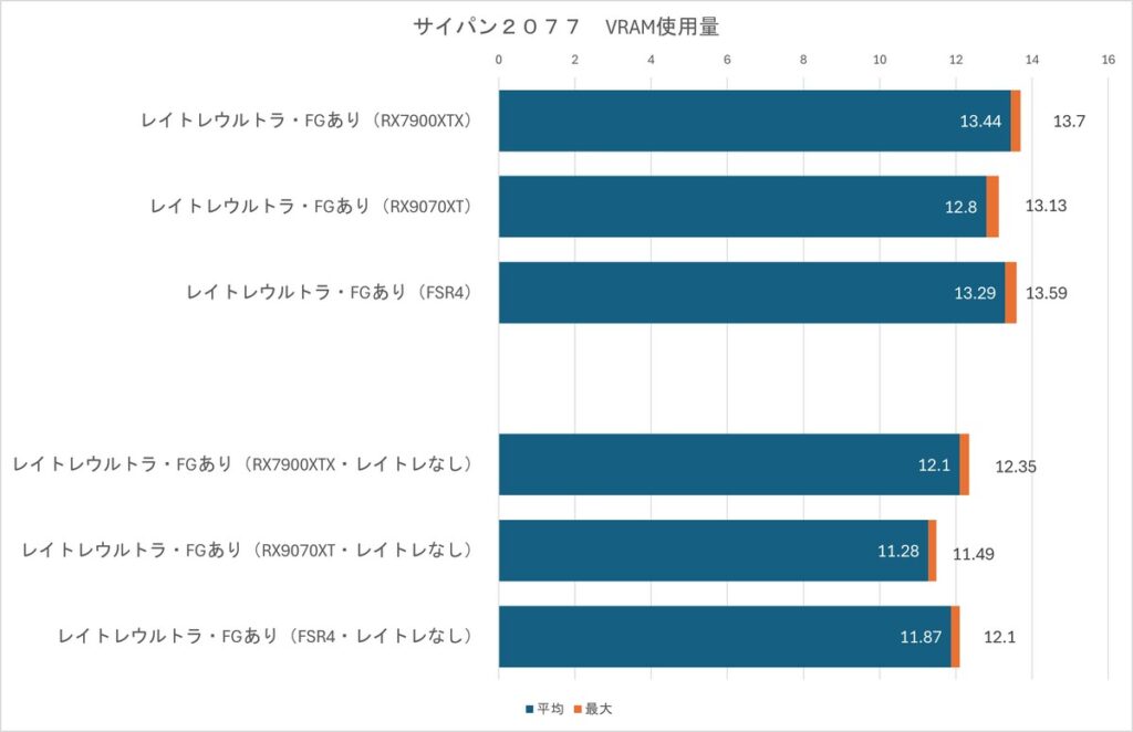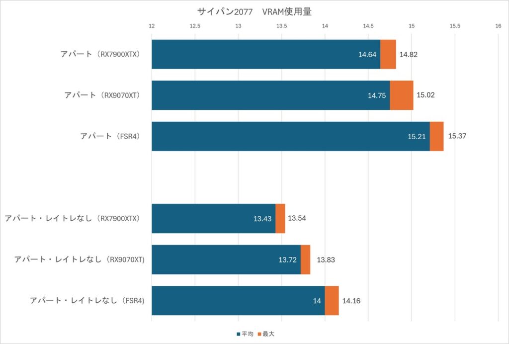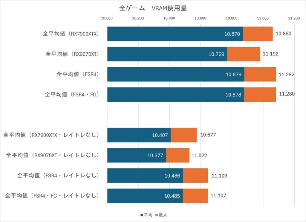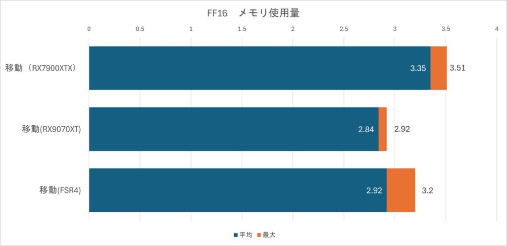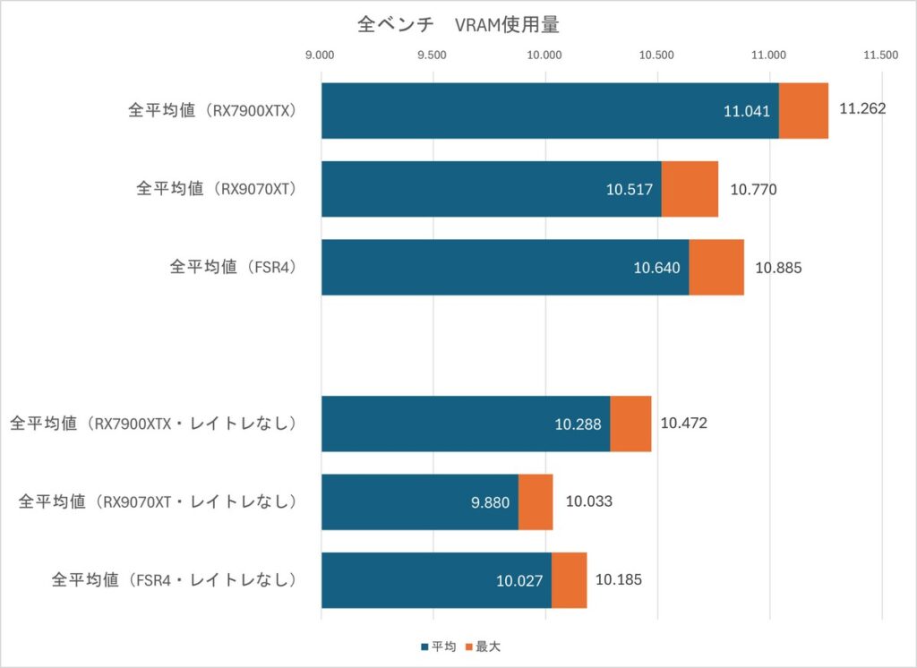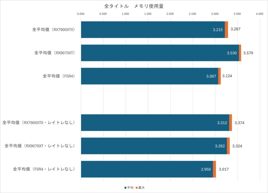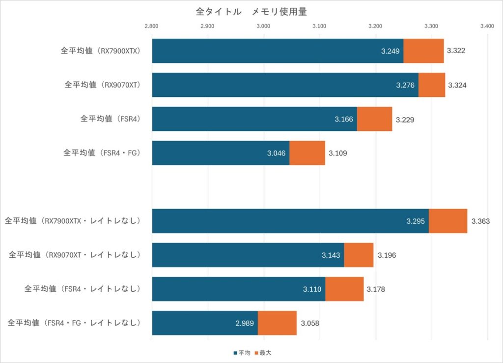 FSR4を起動すると増加しますが、それでも7900XTXと比べて0.3GBほど低くなっています。