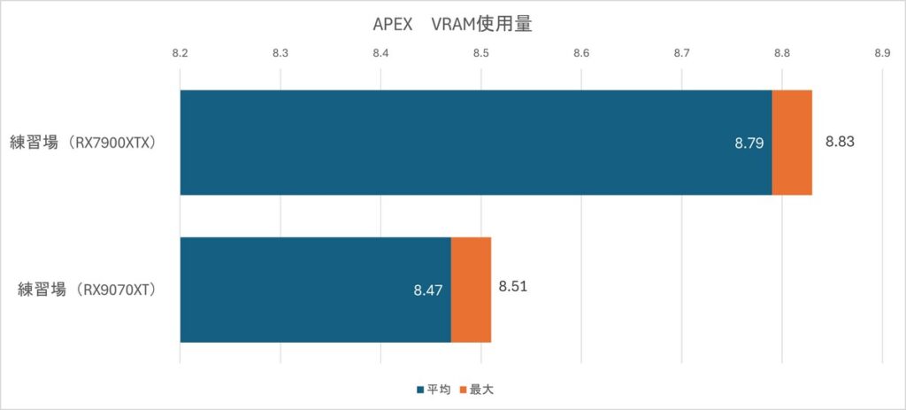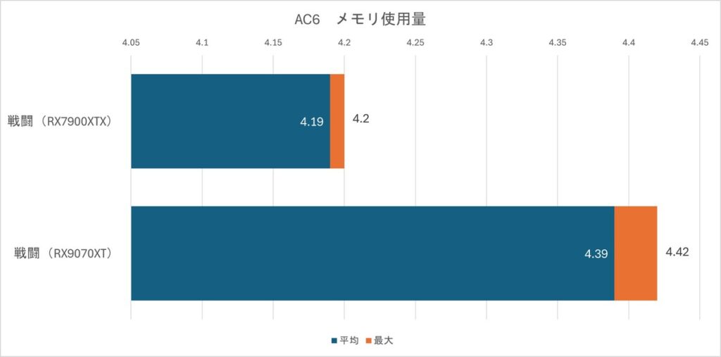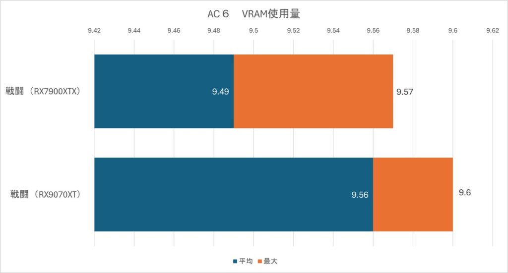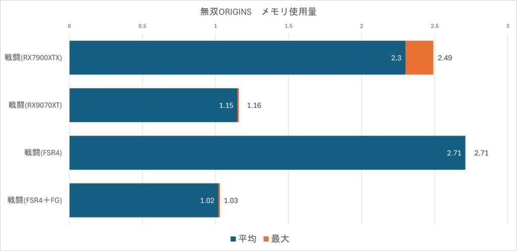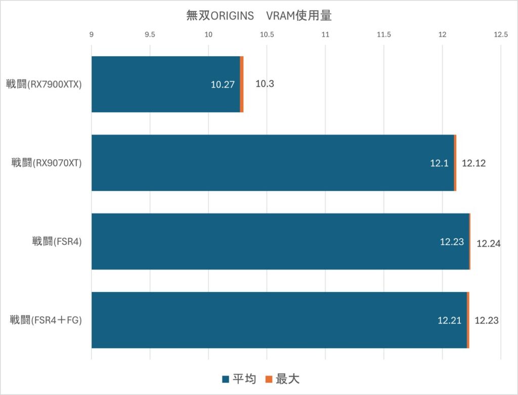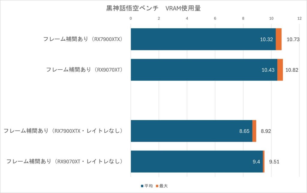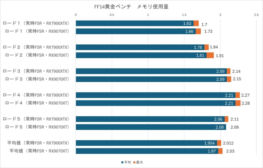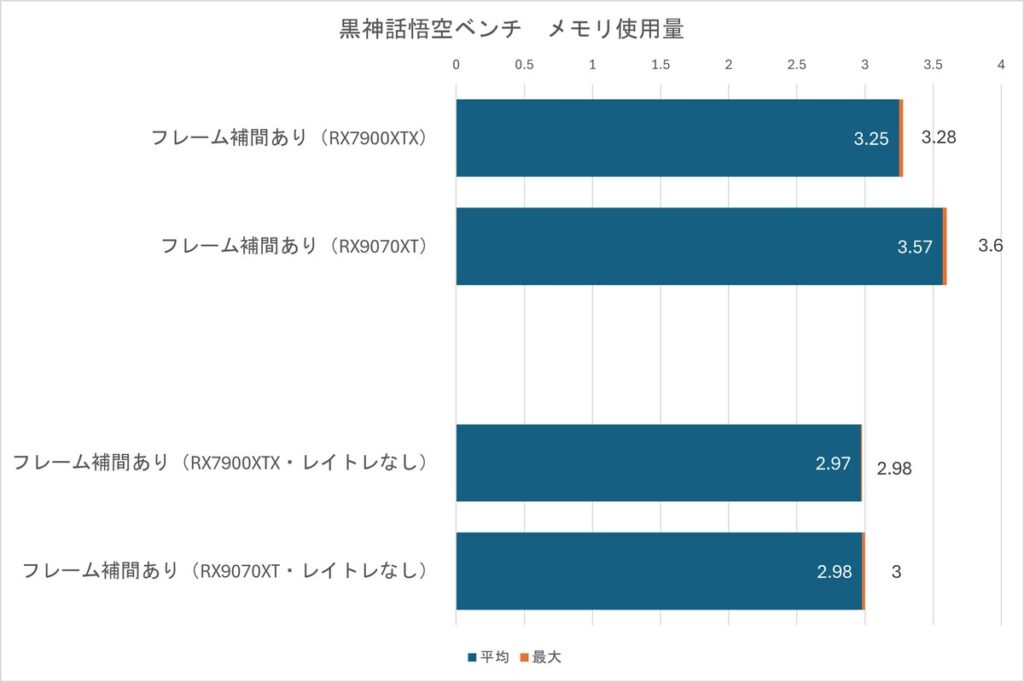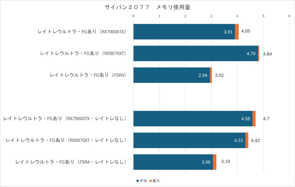 FSR4を起動すると増加しますが、それでも7900XTXと比べて0.3GBほど低くなっています。
