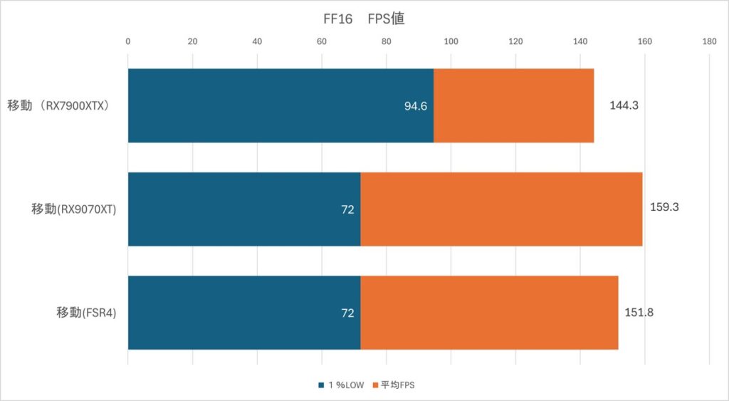 FSR4を入れると平均値は5%ほど下がりますが、1%LOWに変化はありません。