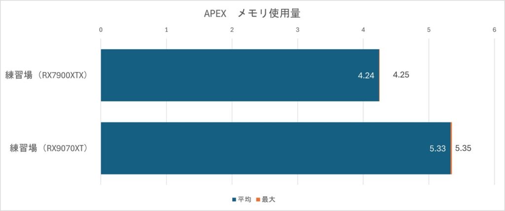 メモリ使用量はXTXが一番高く5GBクラスだったものが3.5GB以下に収まっています。