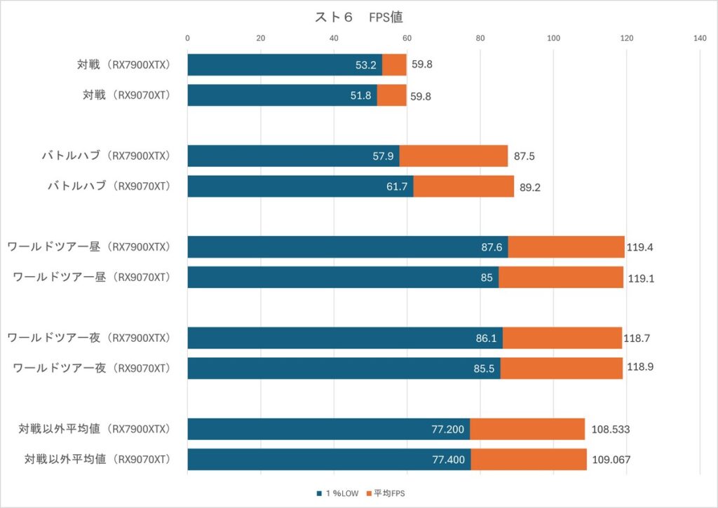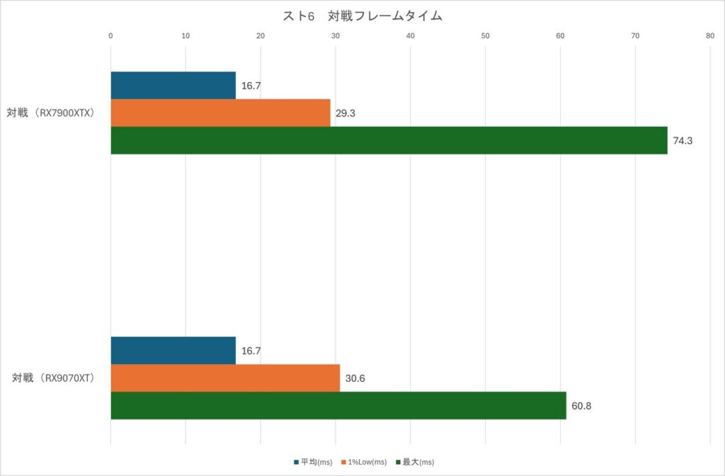 結果レイトレ有無での比率が7900XTXのときには3.8倍以上あったものが、9070XTになると2.5倍まで落ち着く結果となりました。