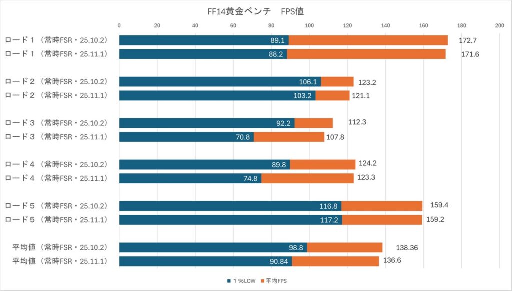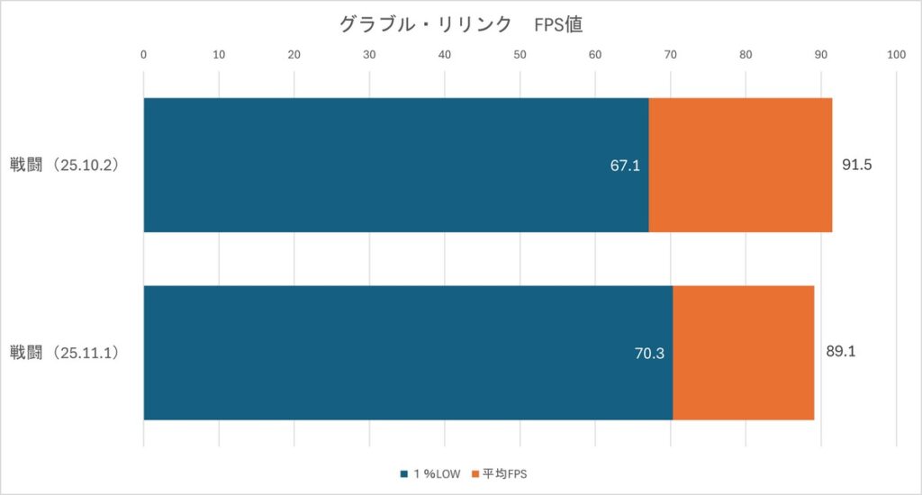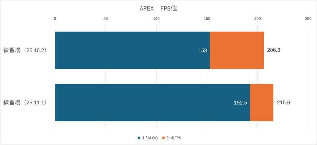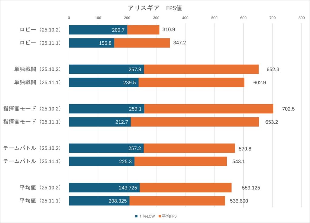 対戦に絞っても1%LOWは4FPS以上、それ以外の平均値でも、平均13.4%、1%LOWに至っては26%も低下しており、パフォーマンスの悪化がかなり顕著に出ました。