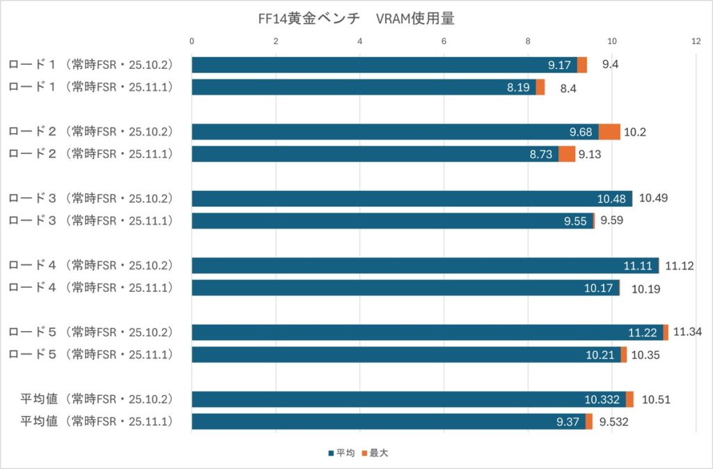 VRAM使用量も低下しており、全体通して4~5%の低下となっています。