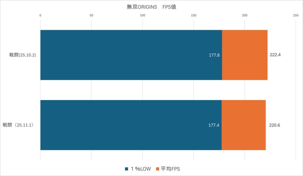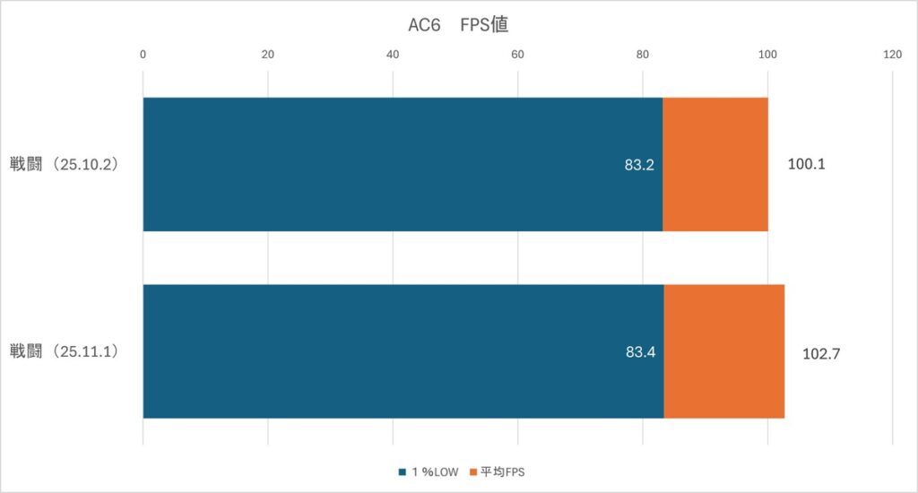 平均FPSが2.5%増加しましたが、1%LOWはほぼ変化がなく、そこまでパフォーマンスに変化は見受けられません。