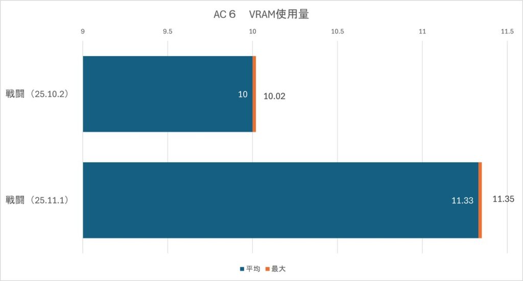 でもVRAM使用量は最大7%、平均で9.5%の上昇と結構上がりました。
