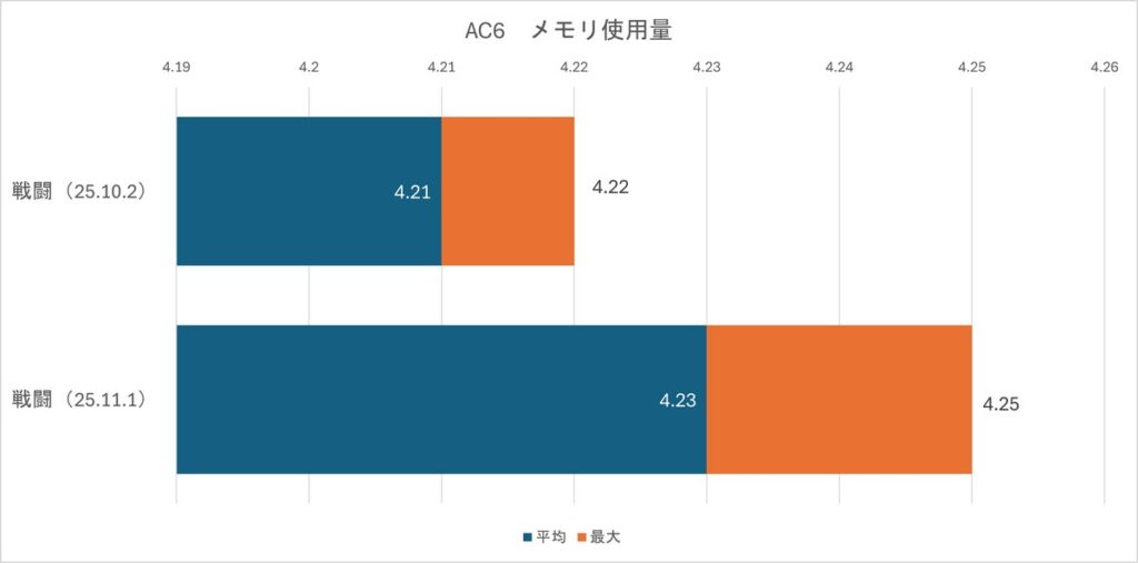 メモリ使用量も最大値は1.1~1.6%の上昇となりましたが、平均値に関しては誤差範囲です。