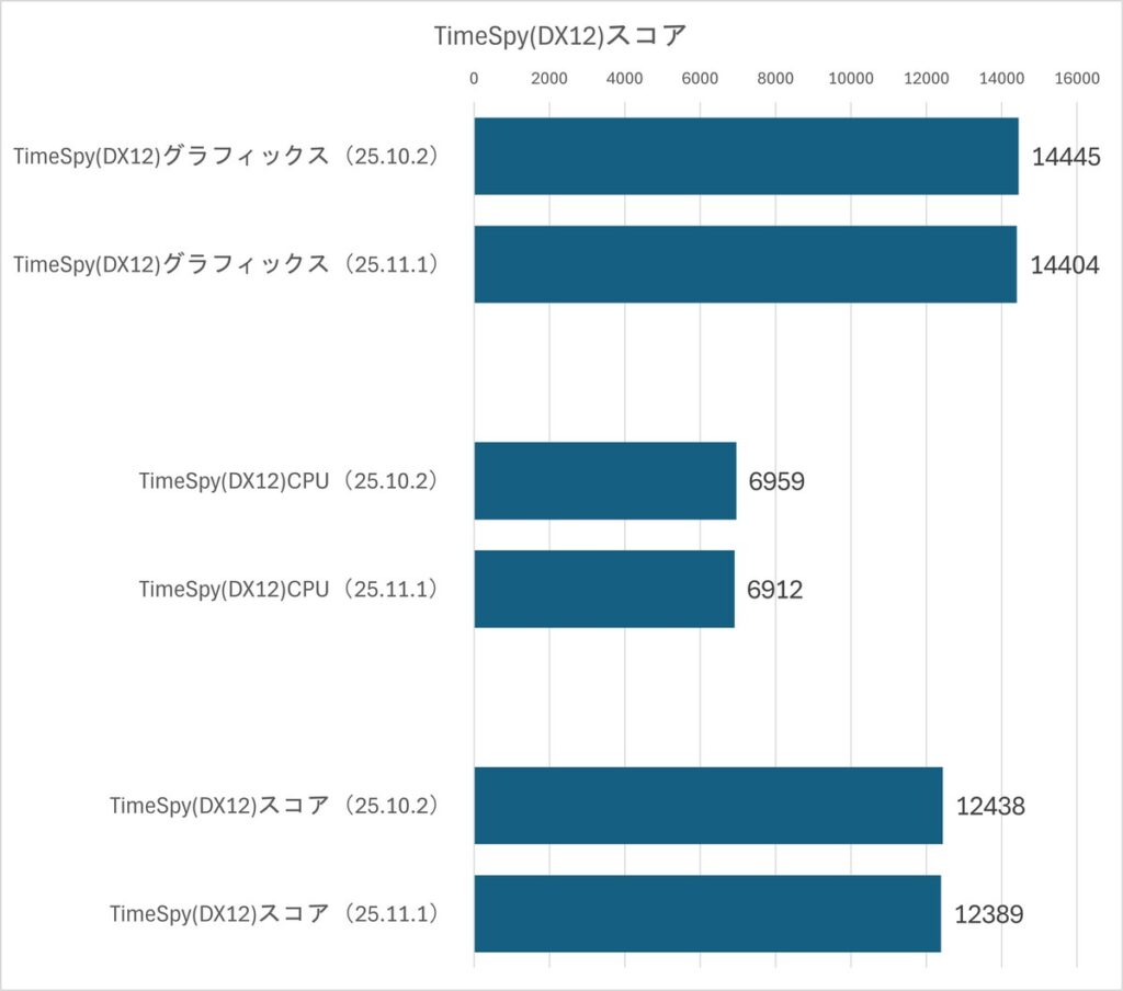 DirectX12も若干の低下こそあれ、これも誤差の範疇といえます。