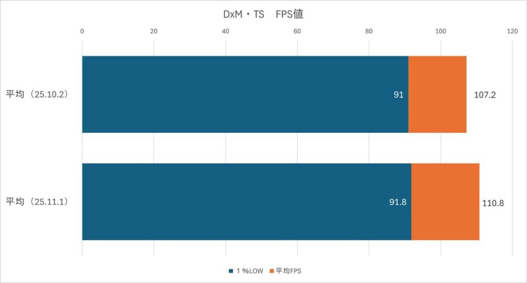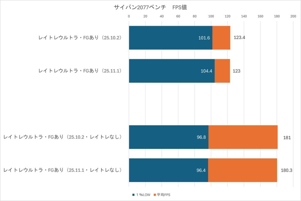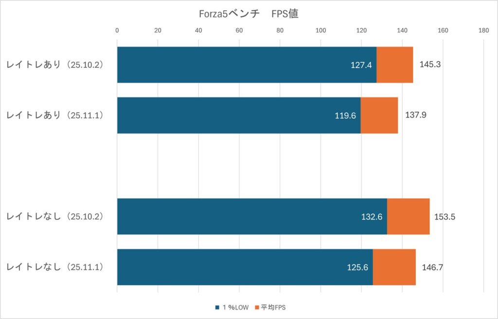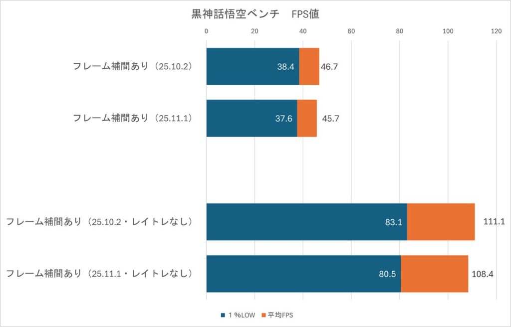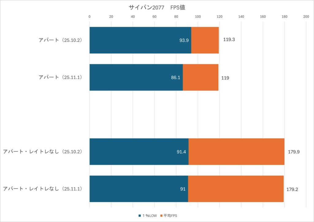 一方でFPSは2.5%ほど全体に低下しており、パフォーマンスについても元に戻った、という印象を強く持ちます。