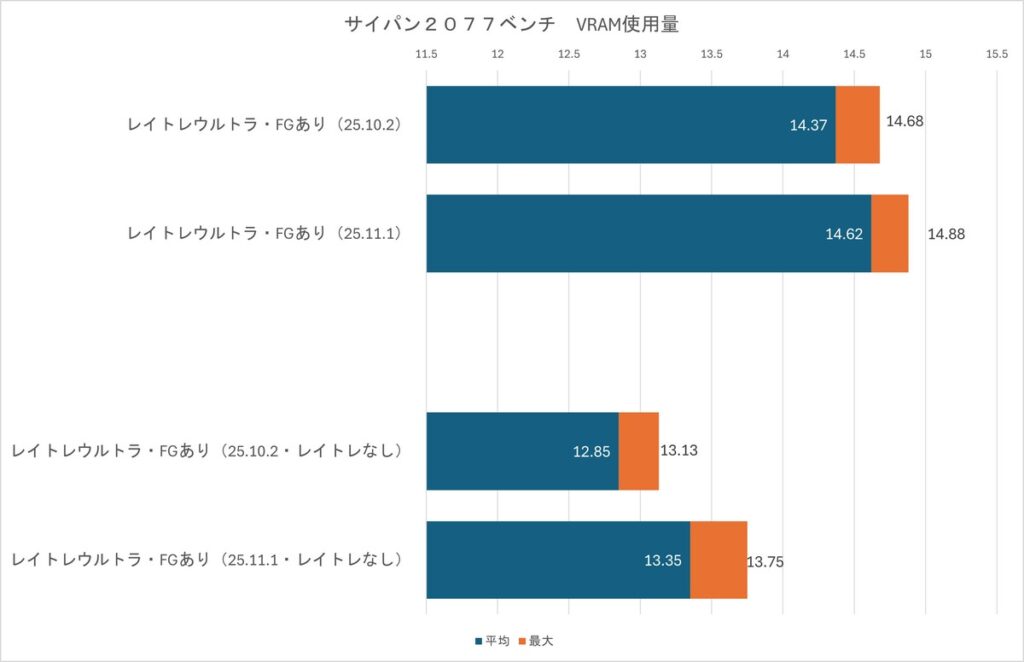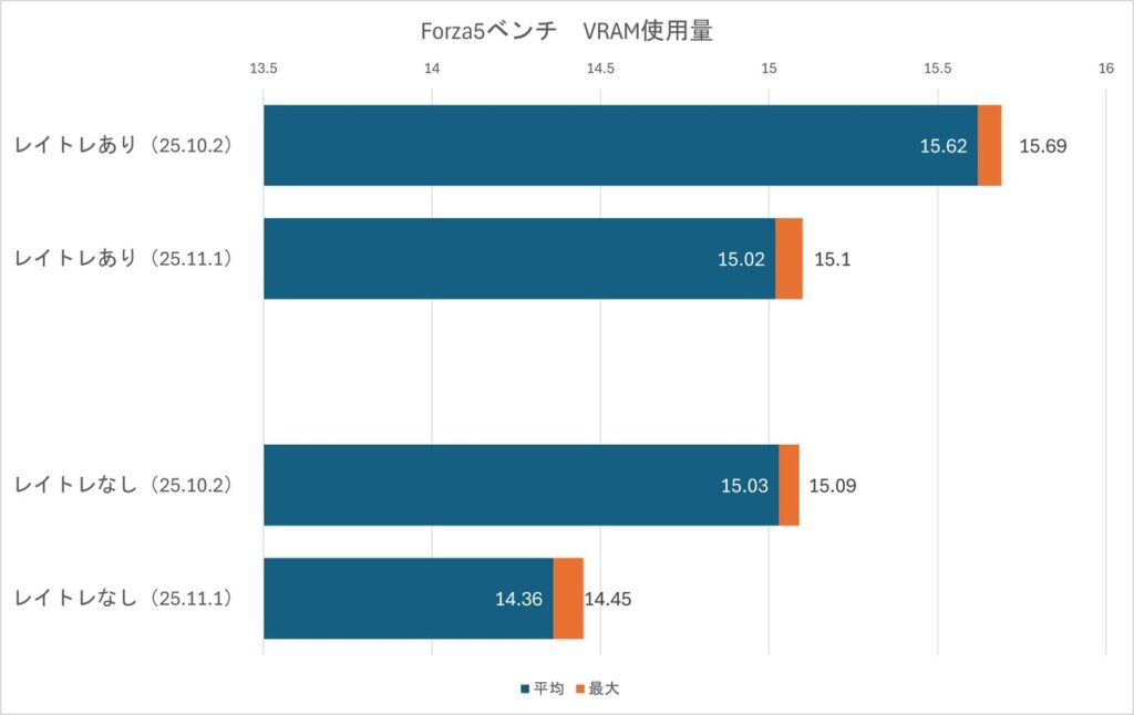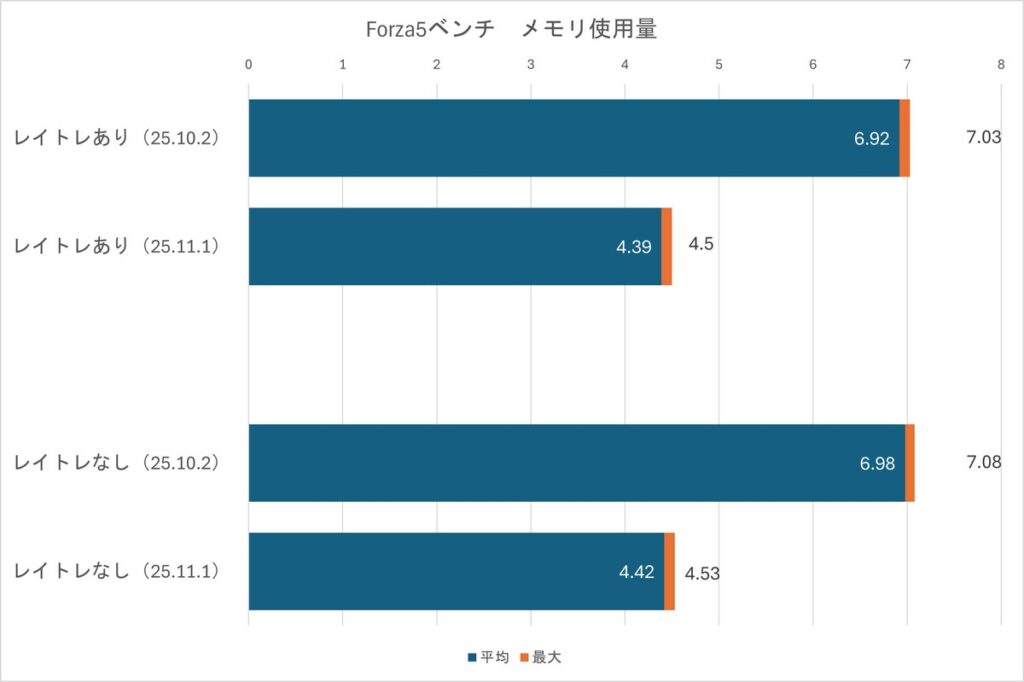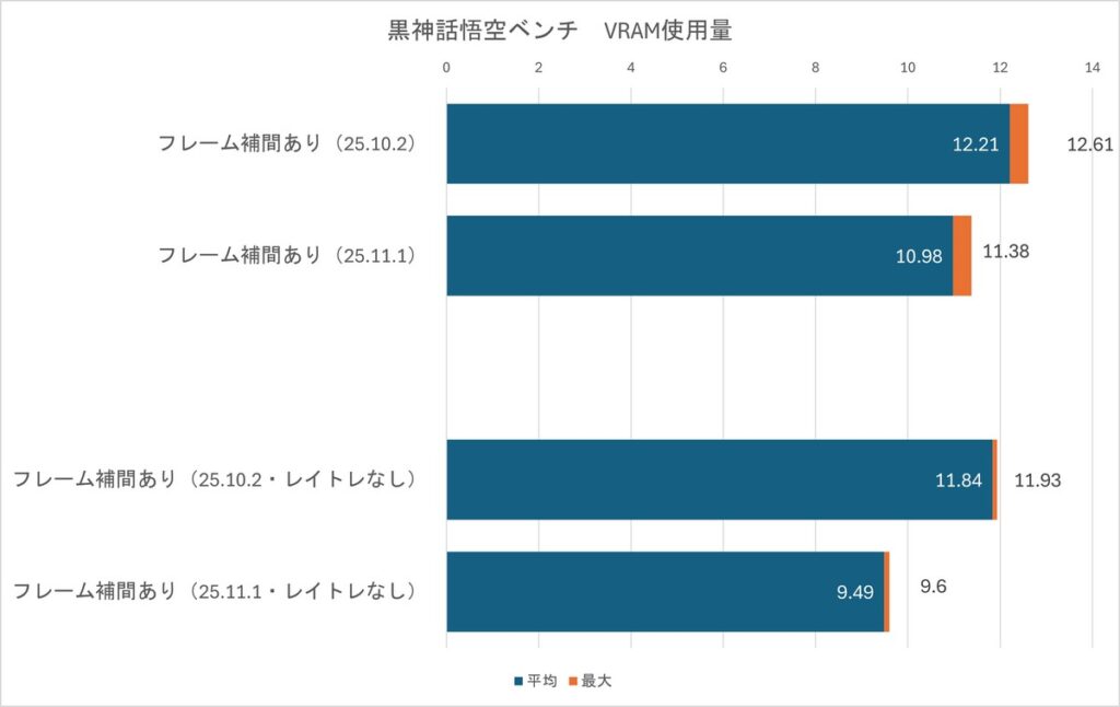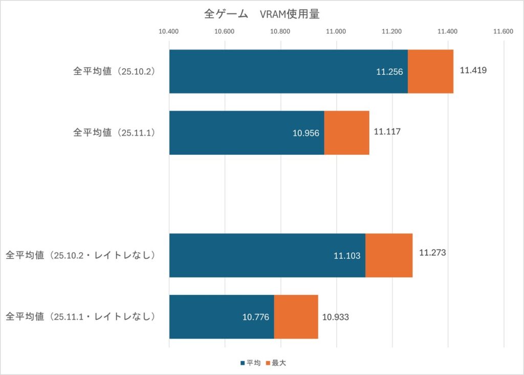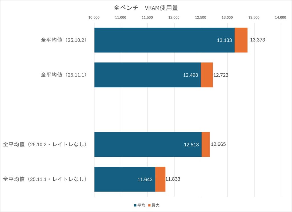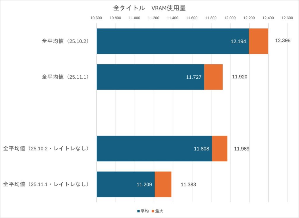 VRAM使用量はレイトレありで5%、レイトレなしで7%の低下となりました。