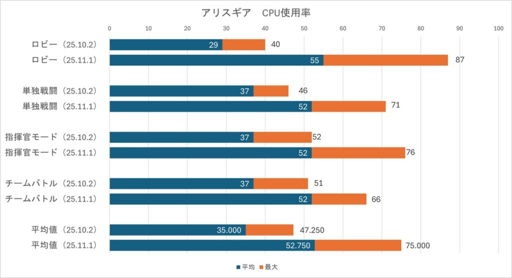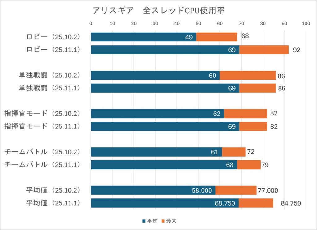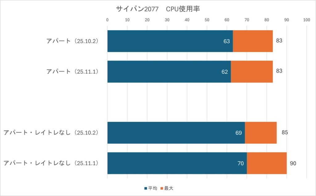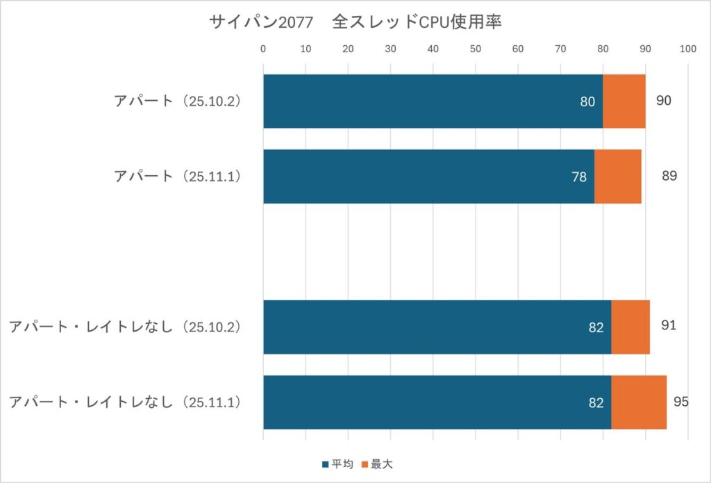 このようにベンチとプレーで推移に差が出ましたが、総じてCPU使用率は上昇傾向になっており、特にレイトレ無しでの上昇が顕著です。