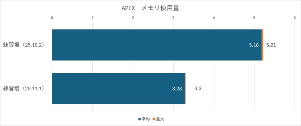 これに引っ張られる形で対戦時のフレームタイムも悪化しており、平均値に変化はありませんが、1%LOWが3msも上昇した結果となり、最大値に至っては5msも上がった形になりました。