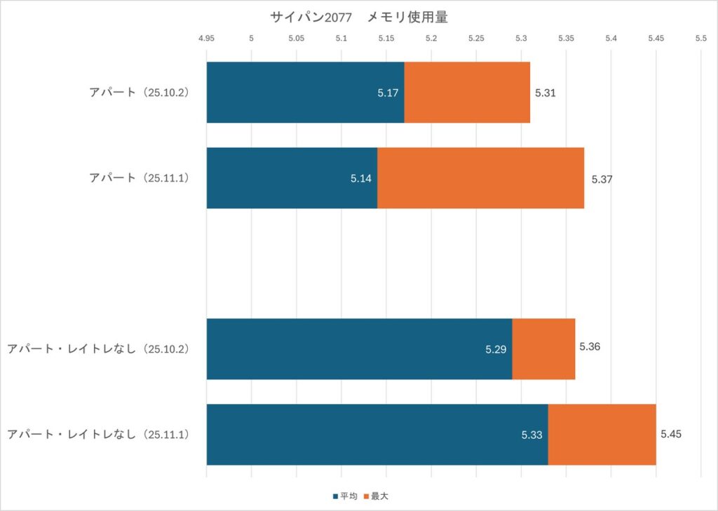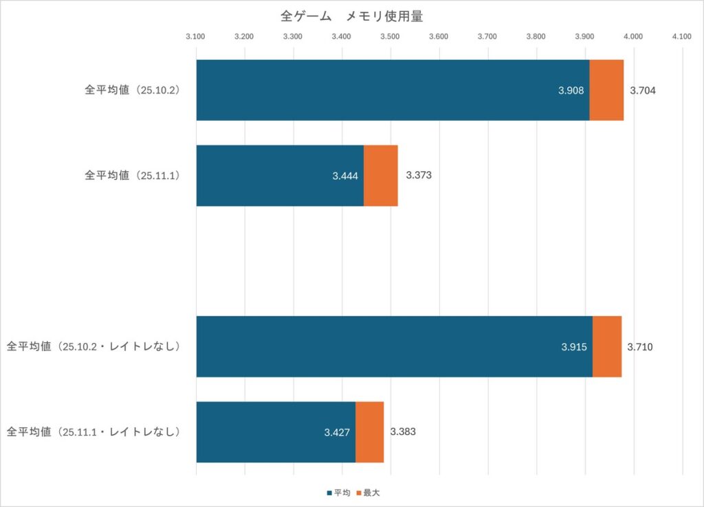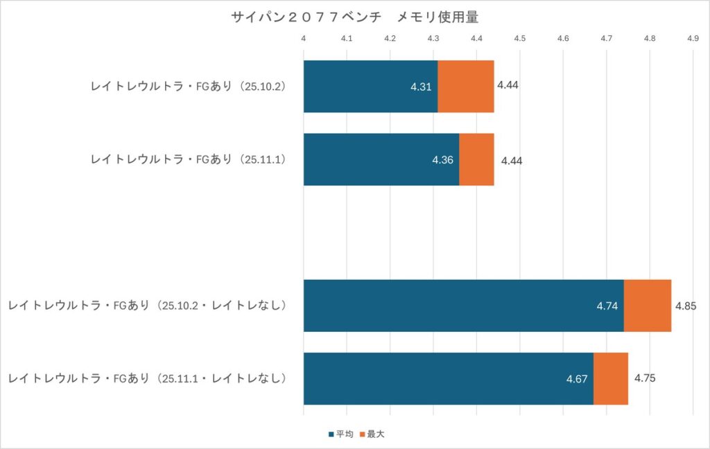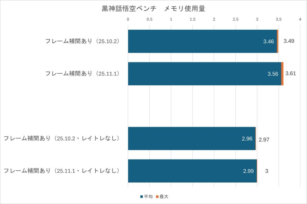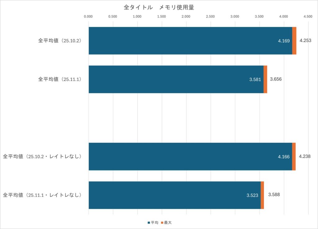 メモリ使用量はレイトレありで3%ほど上昇していますが、レイトレなしでは1%の上昇となりました。