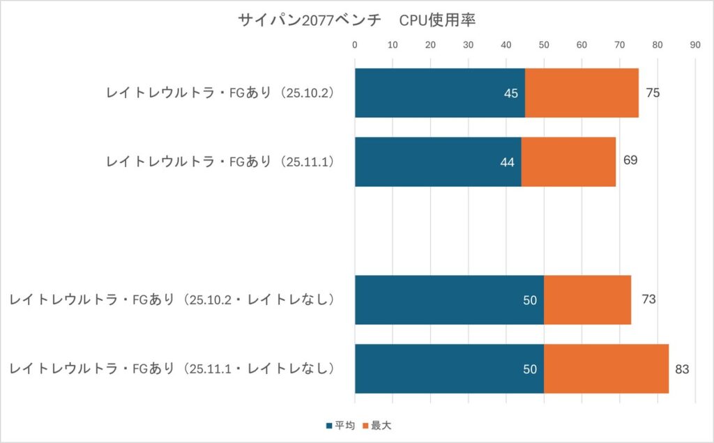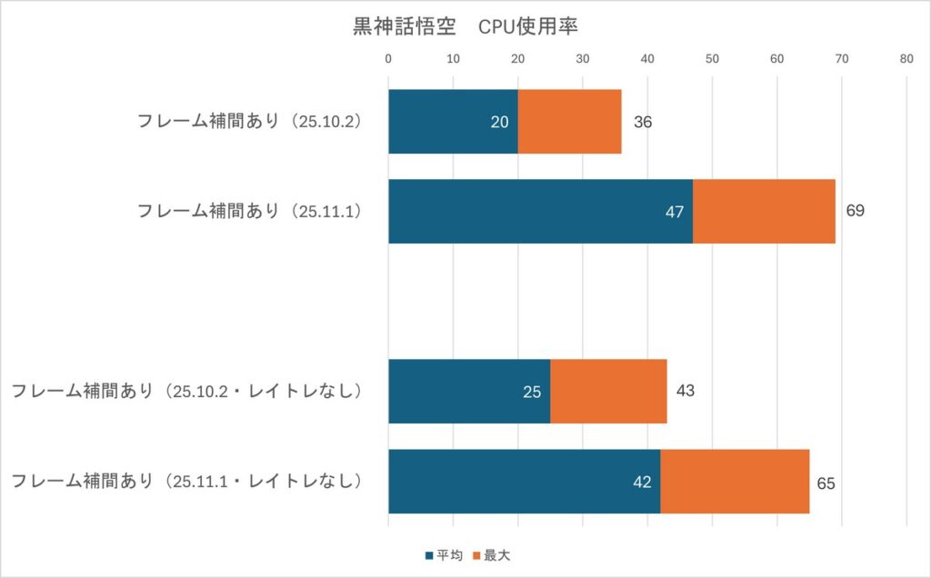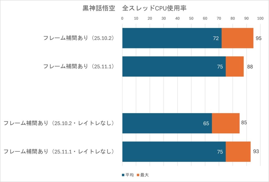 またとにかく全体にCPU使用率は上昇しており、特にそれは黒神話悟空のベンチが顕著であったため、WorkGraphの影響は一気に薄くなった、とも言えます。