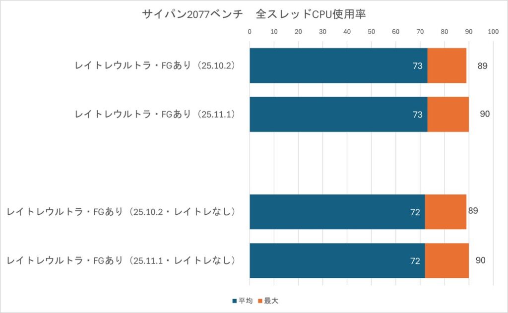 全スレッドの場合だと、レイトレありで最大値の低下がありましたが、ほかは平均値、最大値ともに上昇しており、ここにもWorkGraphの痕跡は見受けられません。