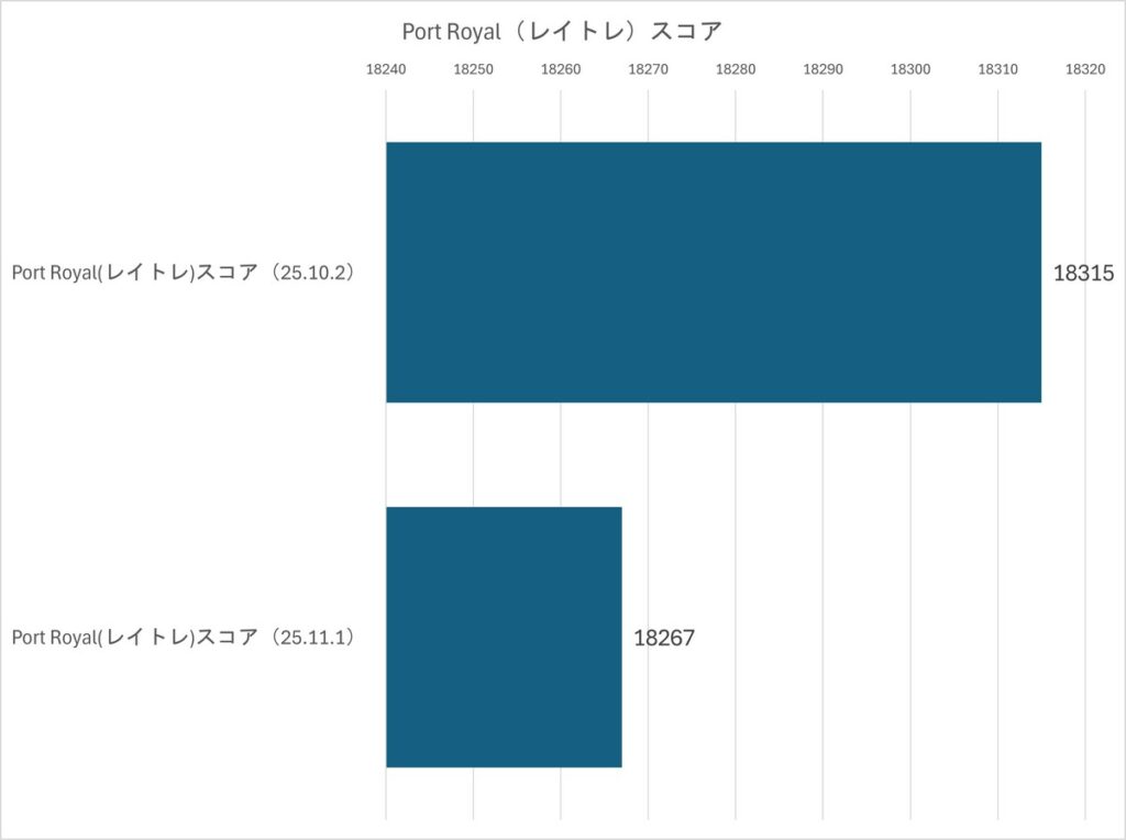 レイトレスコアもグラフだと大きく見えますが、実際の値は0.3%未満の違いしかなく、誤差範囲といえます。