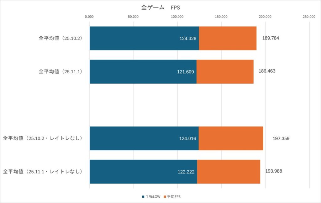 全部の平均では、平均FPSは2%、1%LOWは3%の低下となっています。