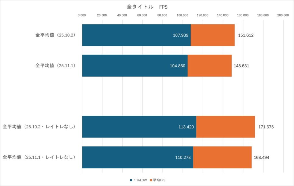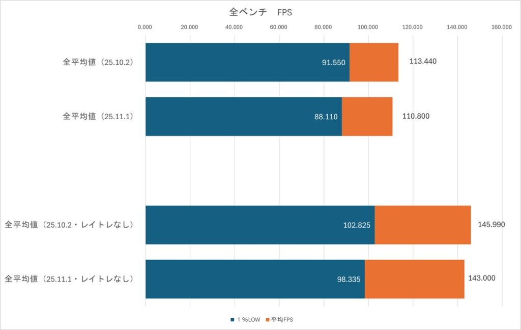 ベンチマークのみを集計した場合だと、平均FPSはレイトレ有無に関わらず2%前後の低下ですが、1%LOWがレイトレありで3.8%、レイトレなしでは4.4%低下しています。