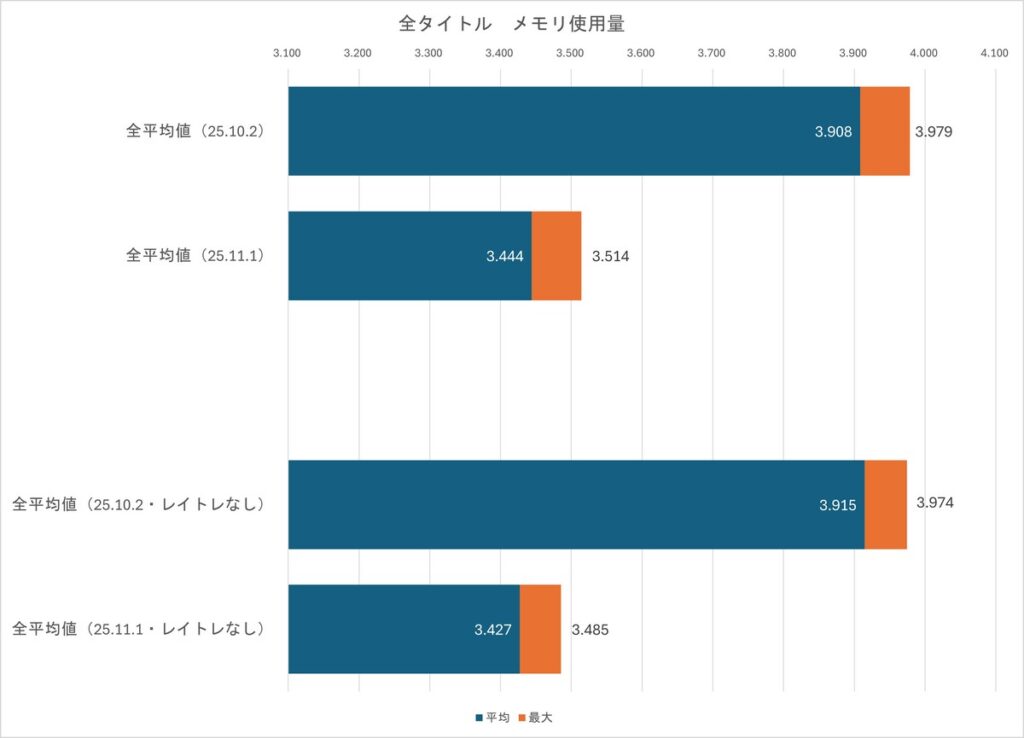 一方でメモリ使用量はレイトレなしの時の低下が顕著で、1.5~2%の低下です。