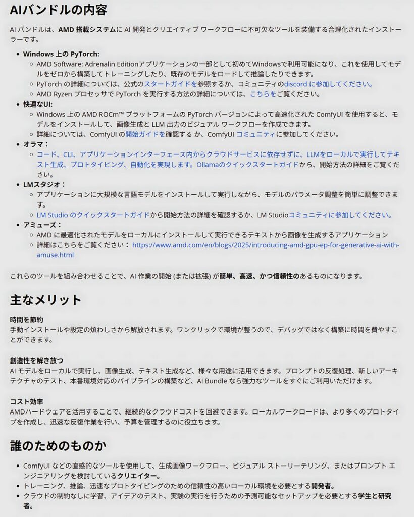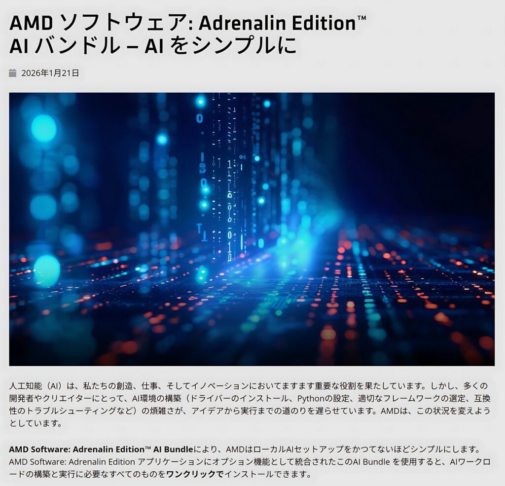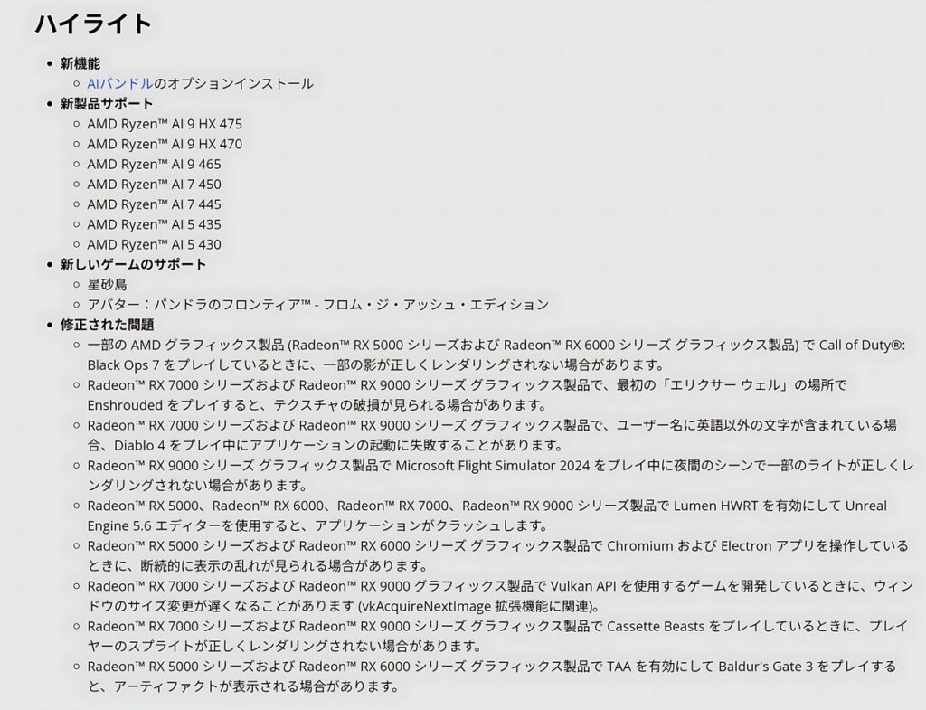 AIバンドルのインストール可能、及びCESで発表のあったRyzenAI400シリーズへの正式対応がメインとなっています。