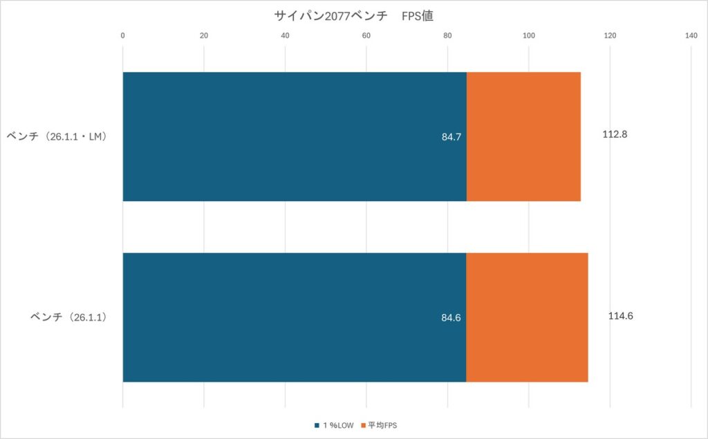 まずはFPS。平均FPSで1.5%、1%LOWで0.1FPSの低下という、余計に数値が悪化したことを如実に表す結果になりました。