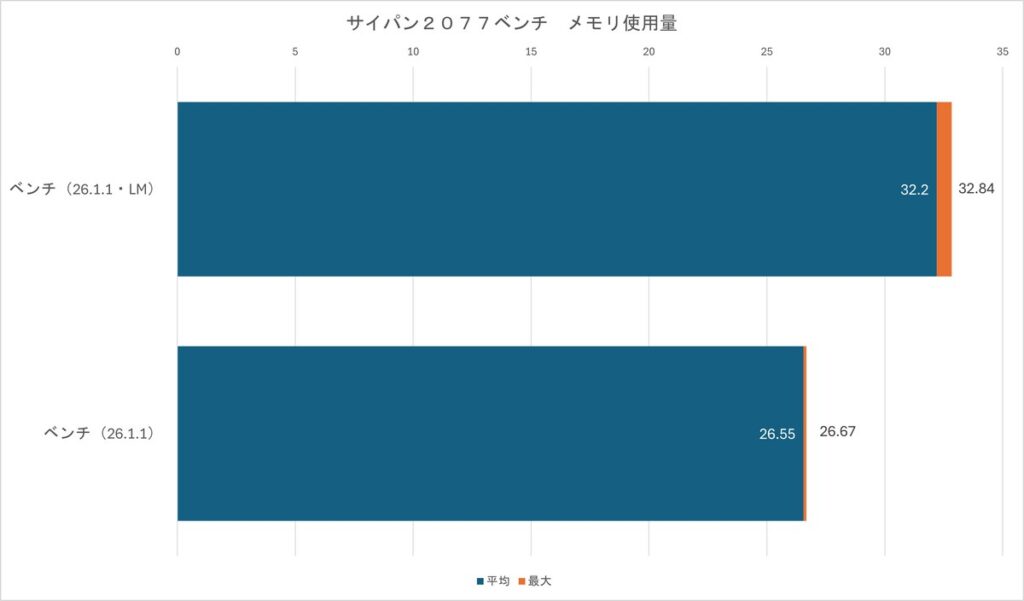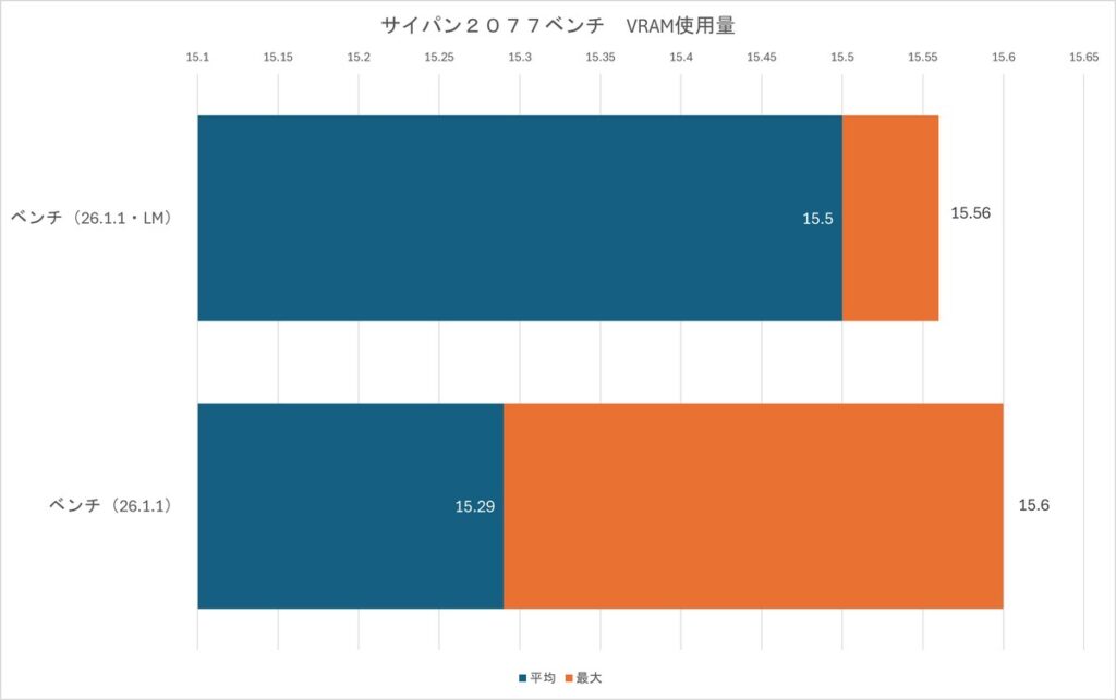 VRAM使用量は最大値でこそLMのほうが減少していますが、平均値では1.35%も開きがあり、かなり上限に張り付いていることがわかります。