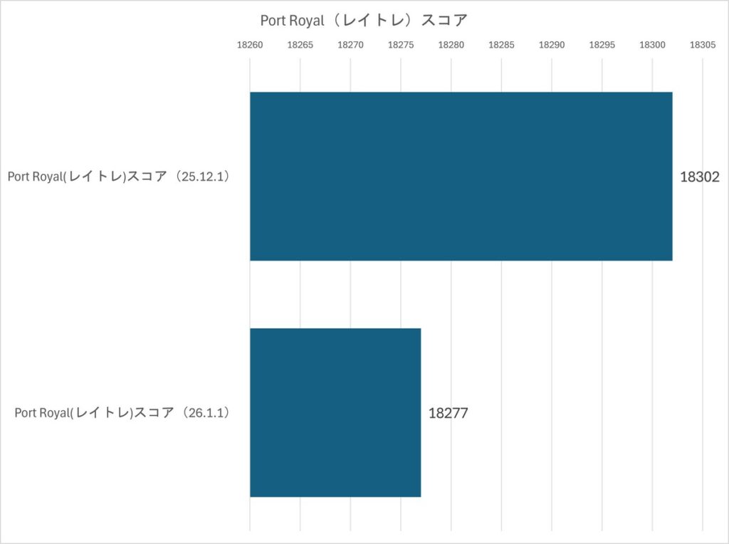 レイトレ指標のPortRoyalスコアはグラフだと大きめに出ちゃいましたが、数値自体はわずか25しか変化がなく、誤差範囲です。