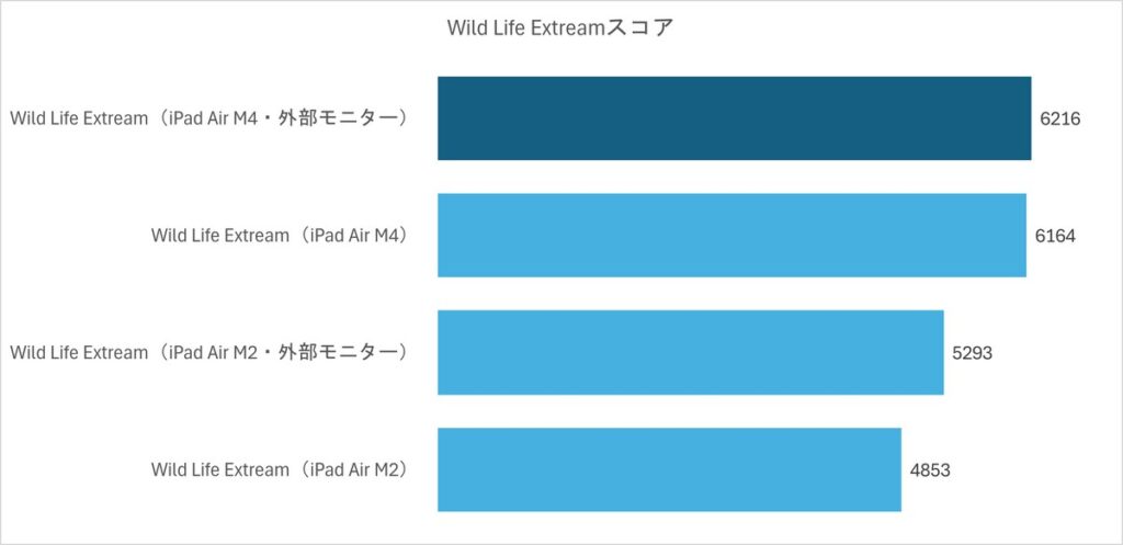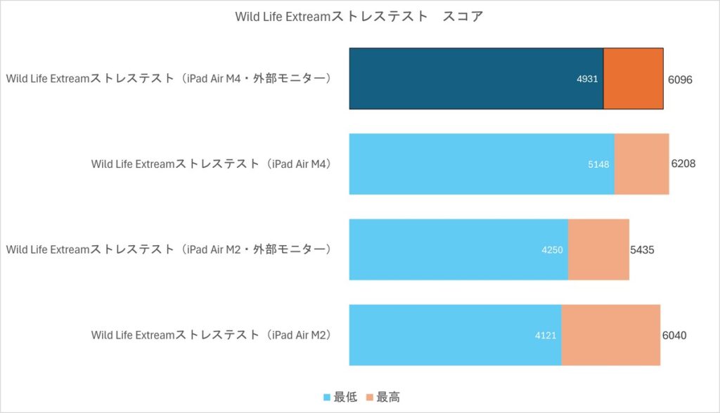やはり外部モニター接続だと負荷がかかるのか、スコアは落ちます。