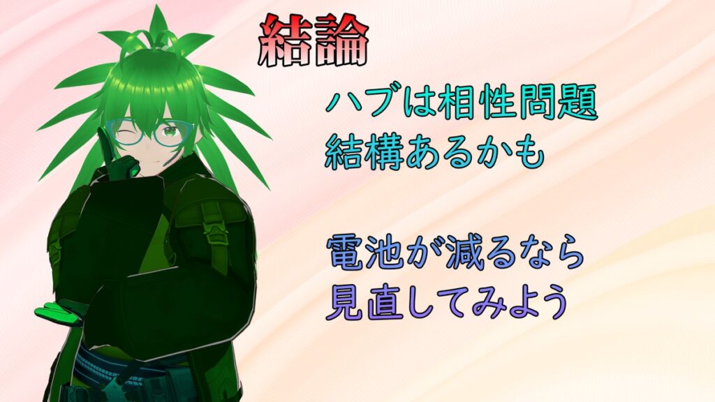 今回は条件としてハブには電源を刺さないことで、充電されない状況を作ってどうなるか、ということを試してみました。