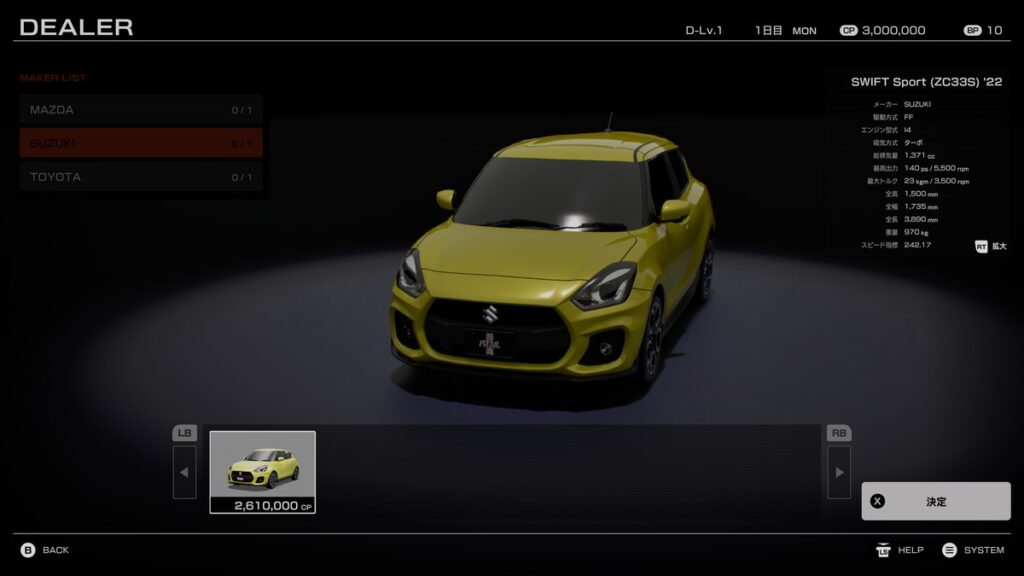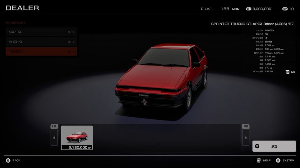 スプリンタートレノ(AE86)の三台から最初の車を選びます。