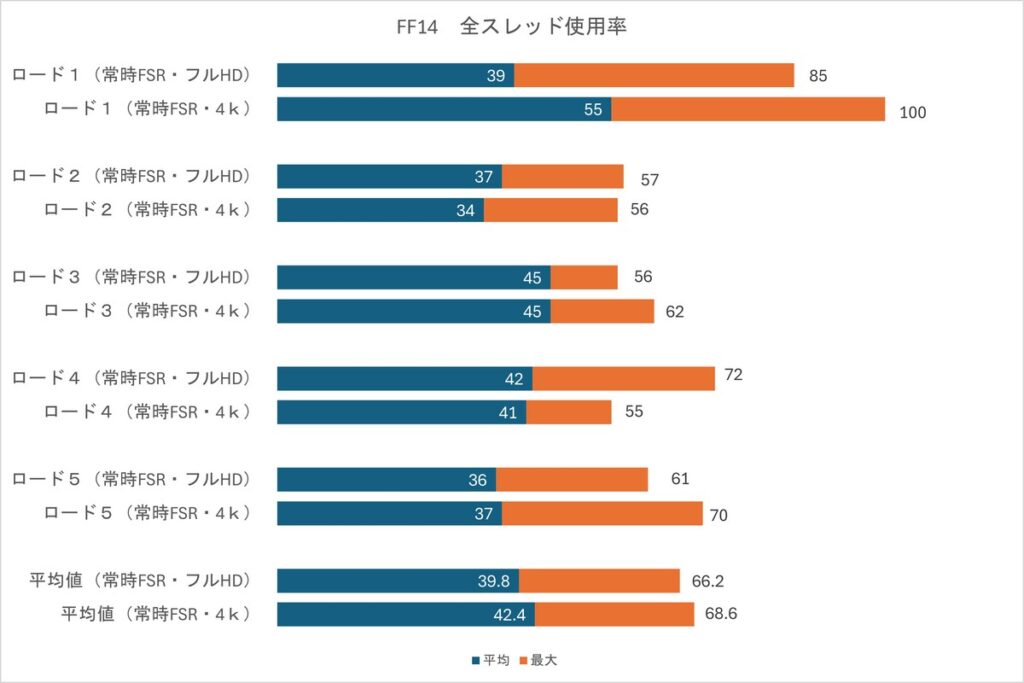 全スレッドに関してはフルHDはかなり伸ばしているため、この地点で結構CPUボトルネックになってるのが分かります。