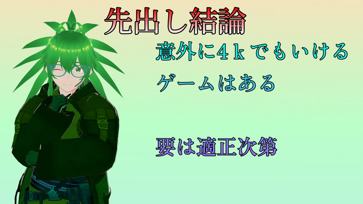 FF14はそこまでFPS要求するわけでもないので、そこまでFPSにこだわらないのであれば4kはバッチリいける形ですね。